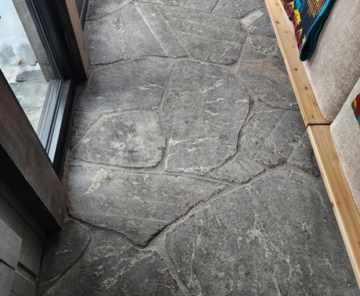 We have many opportunities to make flagstone, steps, copings, treads and other landscape products from our Rosseau Granite blocks. Mostly black with some white quartize lines.