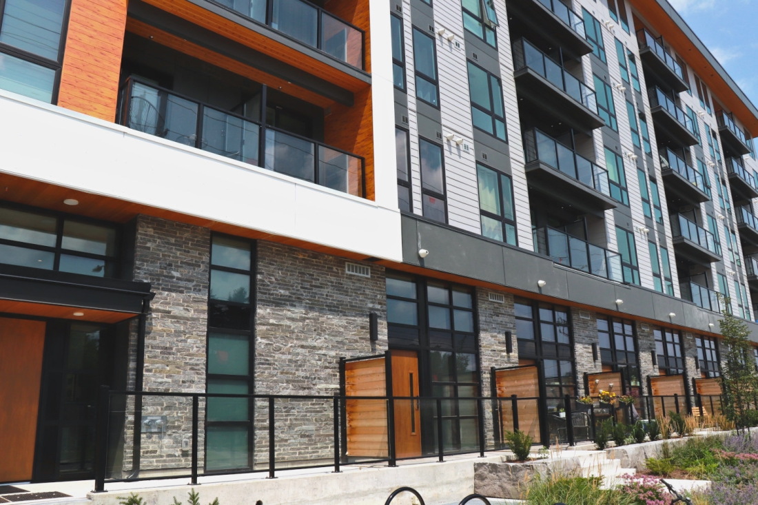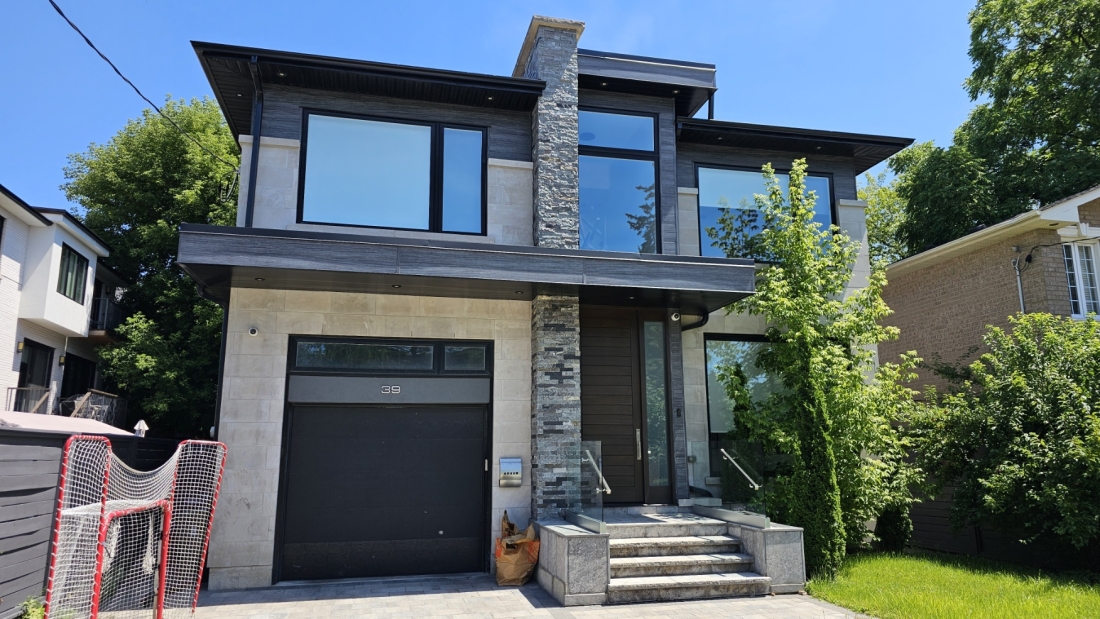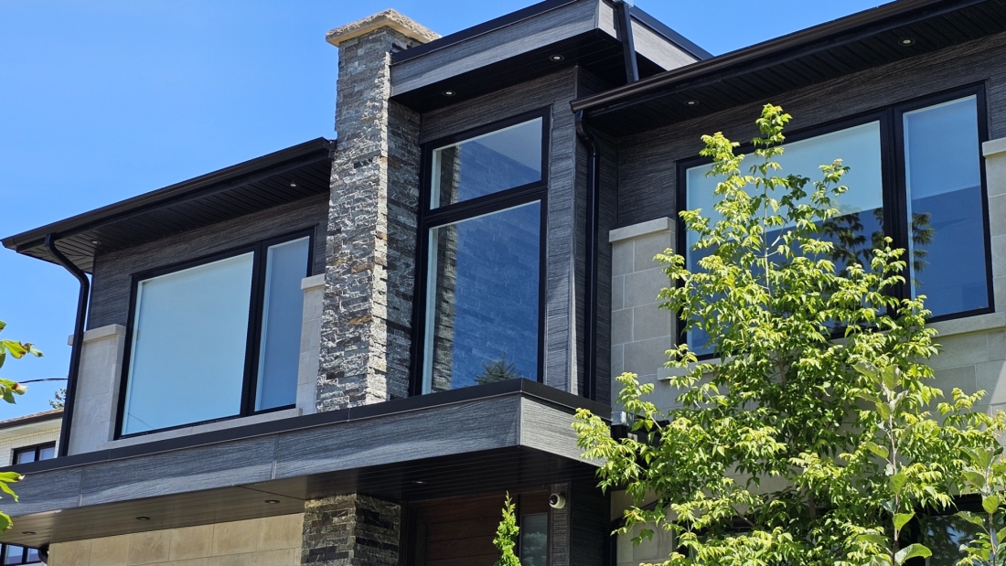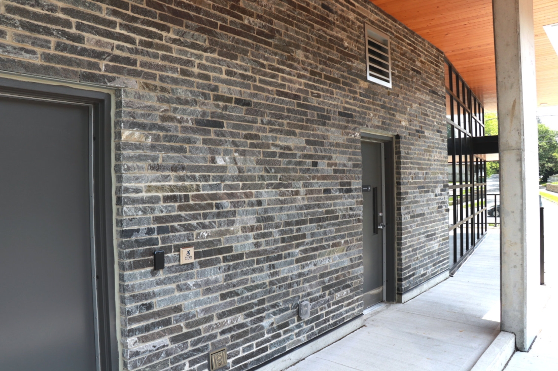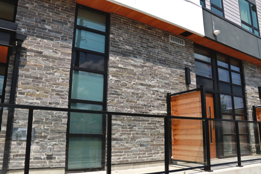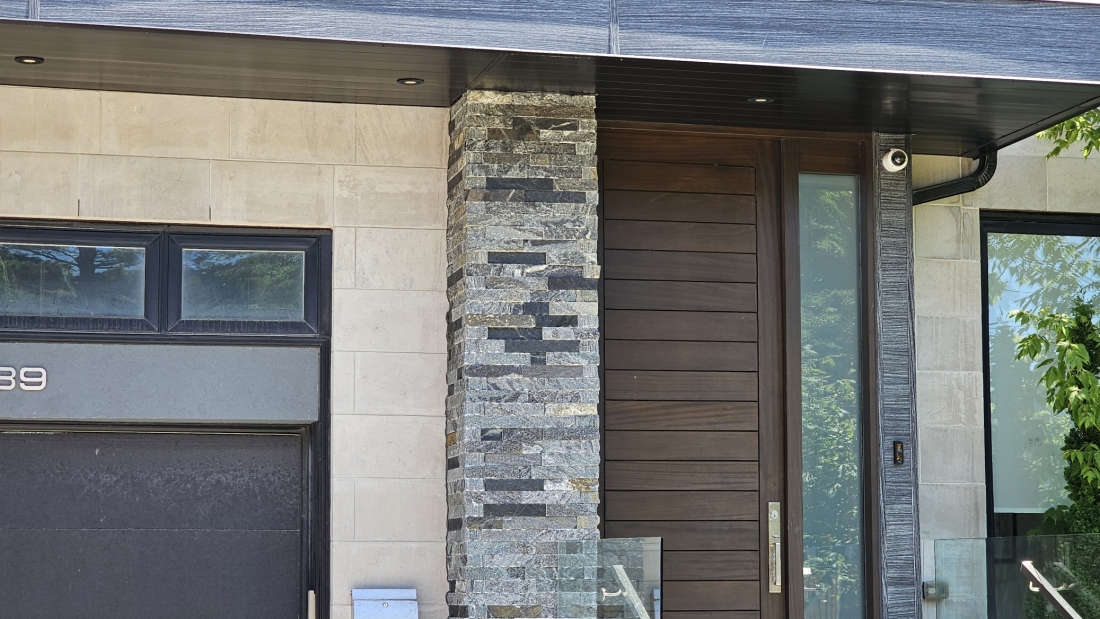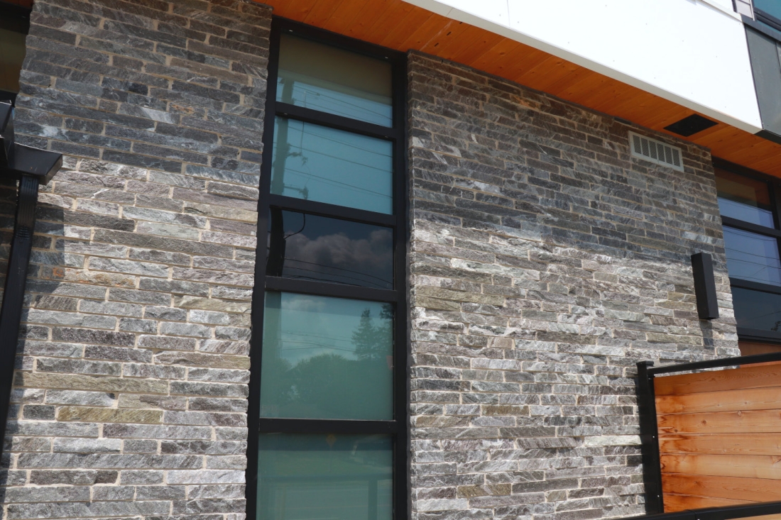 Pacific pearl is cut to the same height as Ocean ledge (2 1/4"), but instead of the split face, we cut it on the bed face, exposing swirls of dark ocean and waves of white pearl. This stone is considered Ontario marble or gneiss.