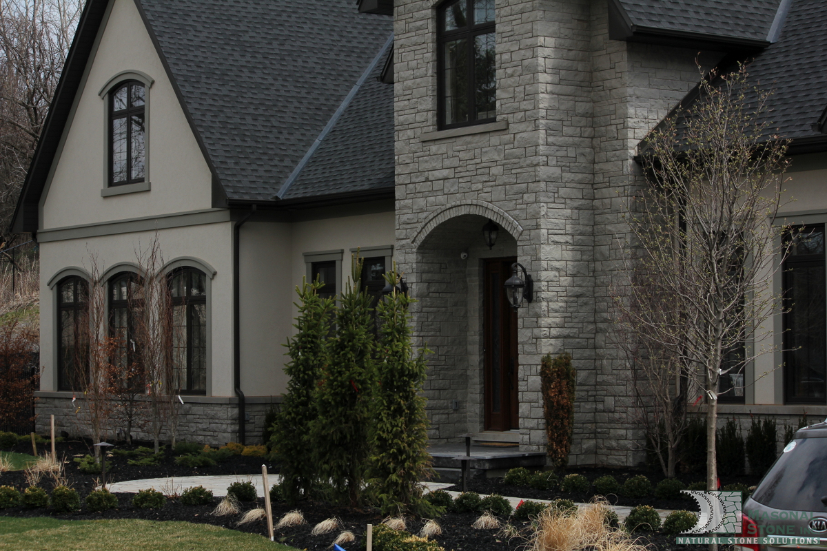 Our new Cobalt line of products includes rubbles, drystacks, dimensional ashlars as well as landscape steps, counter tops, hearth stones and stone detailing. It has a cold grey colour with thin dark sedimentary lines going through about 30% of the material. In this 3 size mix, our Cobalt gives a neutral executive look to any project. |