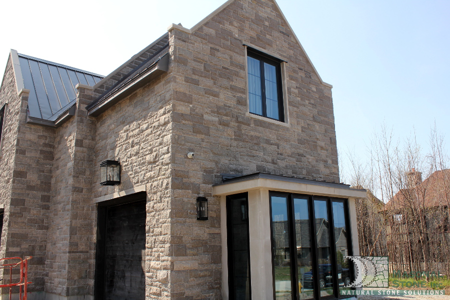 Approx. 1" in thin veneer, and 3.5"- 5" in fullbed |